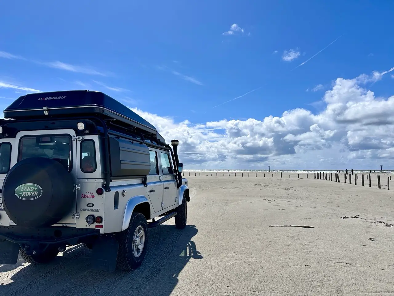 In St. Peter-Ording konnten wir auf einem Parkplatz mit unserem Land Rover über den Sand düsen.